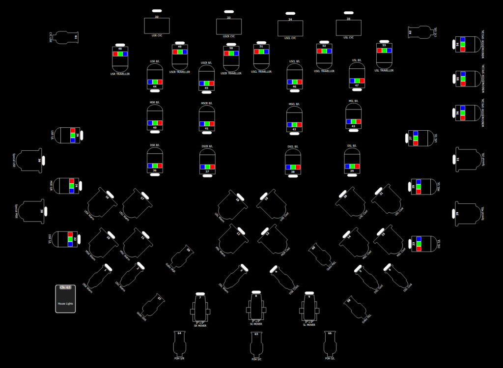 The numbering of Fixtures suits a lighting desk where the three Warm fixtures are adjacent to each other to make it easier to raise all three as a group using three fingers. The sidelights are paired for Downstage, Midstage and Upstage to make it quicker t plot dance and musicals.